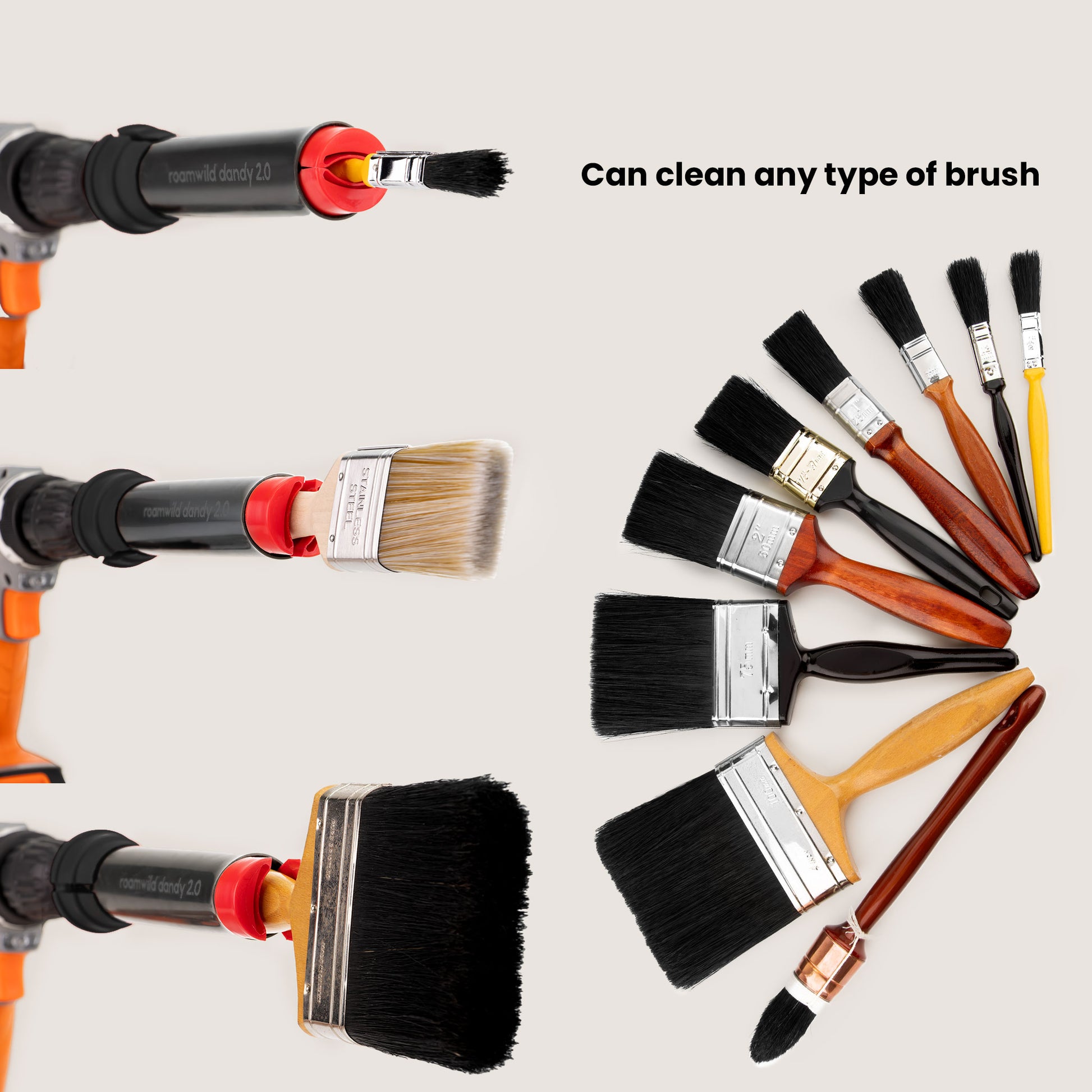 - Works on brushes and rollers: Handles brush sizes 10–125mm and roller sleeves up to 450mm.